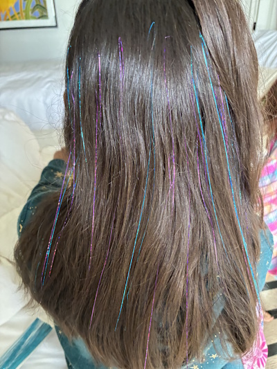 Fairy hair has many names: hair tinsel, glitter strands, silk extensions, etc. It comes in a wide range of colors and is tied onto an individual strand of hair to add sparkle. It is a great alternative for anyone who wants to bring color into their hair without damage. Think of it as hair jewelry!